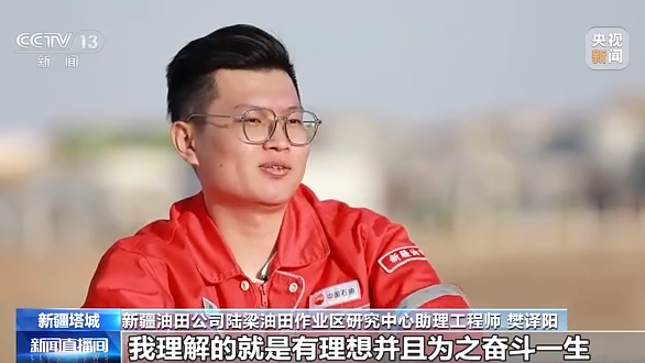 新疆油田公司陆梁油田作业区研究中心助理工程师樊译阳:这油田是2000年建设的,我心想我1998年出生的,比它还大两岁呢,是不是该叫我一声哥呀。但是来了之后发现好多老师傅在这一干就是十九年、二十年,驻守这里十年起步的好多,他们把青春都奉献到陆梁油田所在的这个沙漠里了。