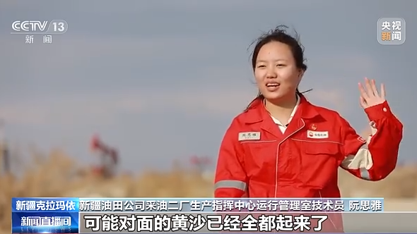 新疆油田公司采油二厂生产指挥中心运行管理室技术员阮思雅:你听像现在这种风,在克拉玛依可能已经算是比较小的风了,有时候在五六级那种风的时候,可能对面的黄沙已经全都起来了,已经看不到我们巡检的路了。当时刚来就觉得,我来了一个什么地方,习惯以后就觉得,我们就是这么个条件,但是已经没有那么难接受了,就觉得掏两下不就完事了。
