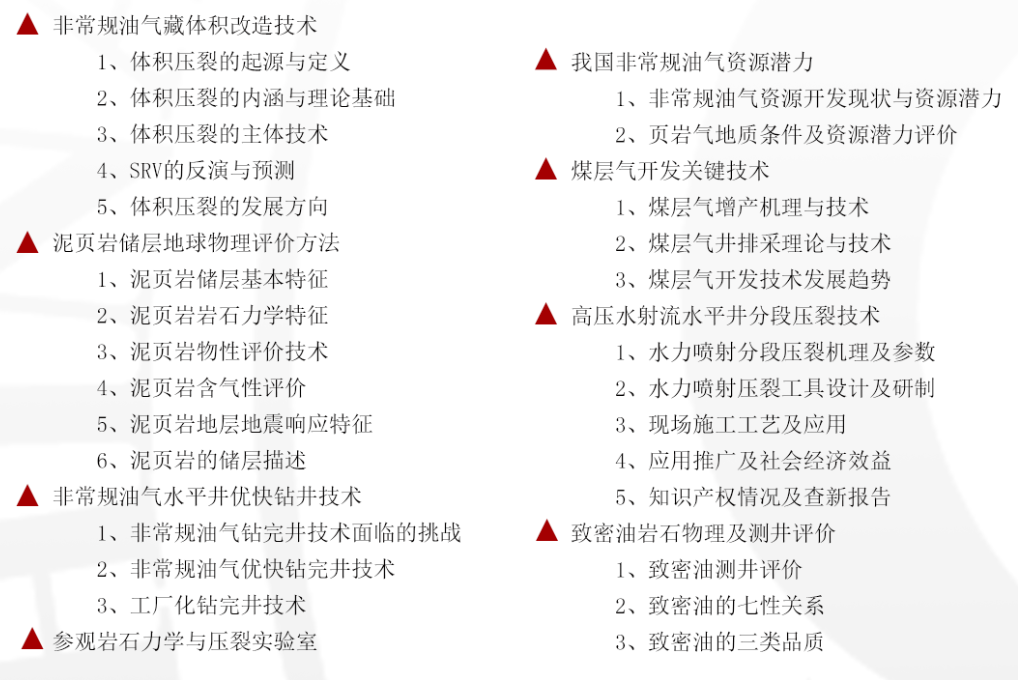 非常规油气勘探开发培训班作为学院的品牌课程项目,采用与人力资源和社会保障部、石油学会合作以及公开课的形式,成功开展页岩气、致密油、非常规等多个专题的培训班,积累丰富的项目研发和运行管理经验。