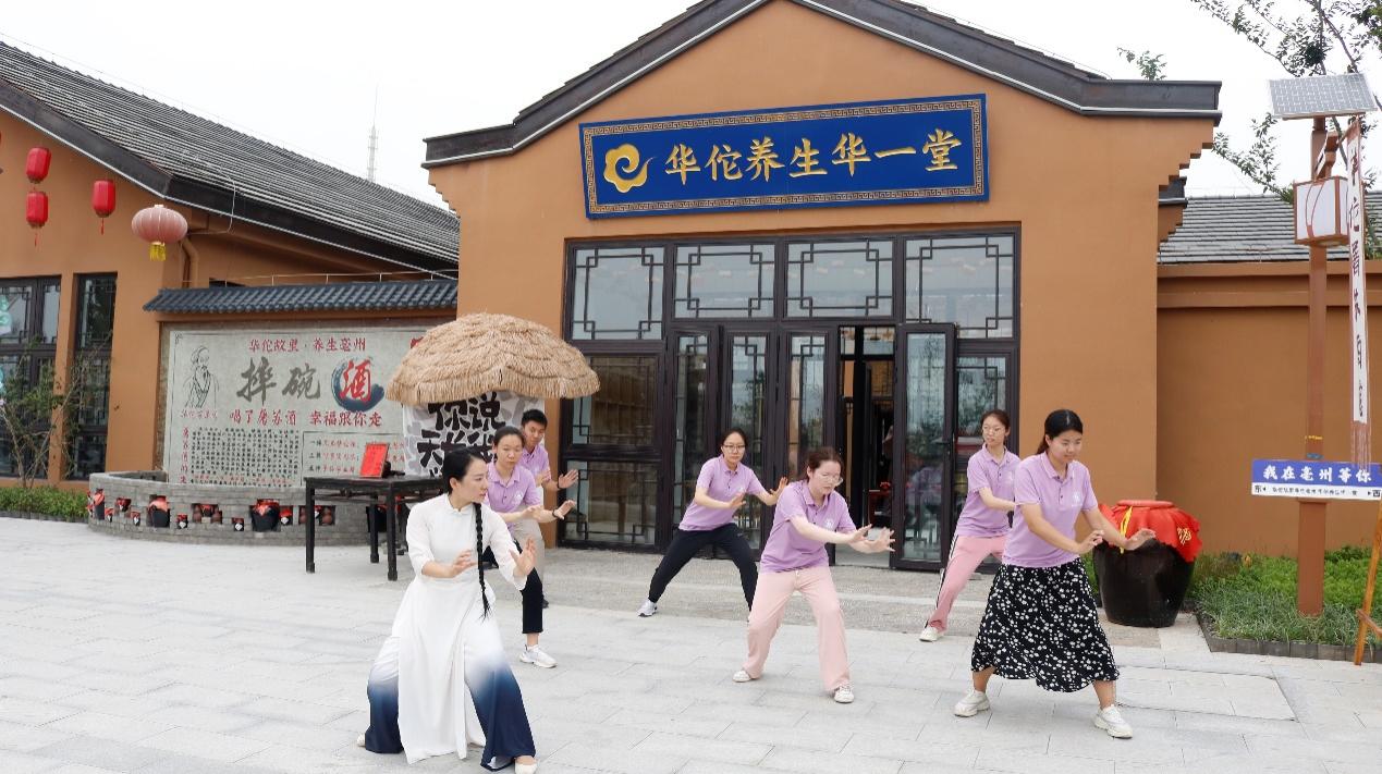 实践团成员随华一步入华一堂养生馆,学习将中医原理运用于调理和养生的方式。华一在华佗百草园为团队成员们表演五禽戏,每个动作彰显力量和动物独有的特征。