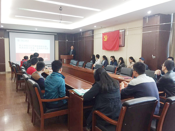 4月19日下午,化学工程学院在化工楼B座403会议室举办了2016年度化工学院优秀党支部、优秀党务工作者、优秀共产党员颁奖大会,化学工程学院党委书记郭绪强、化学工程学院党委副书记胡建茹以及全体学生党支部书记和优秀党员代表参加了大会。