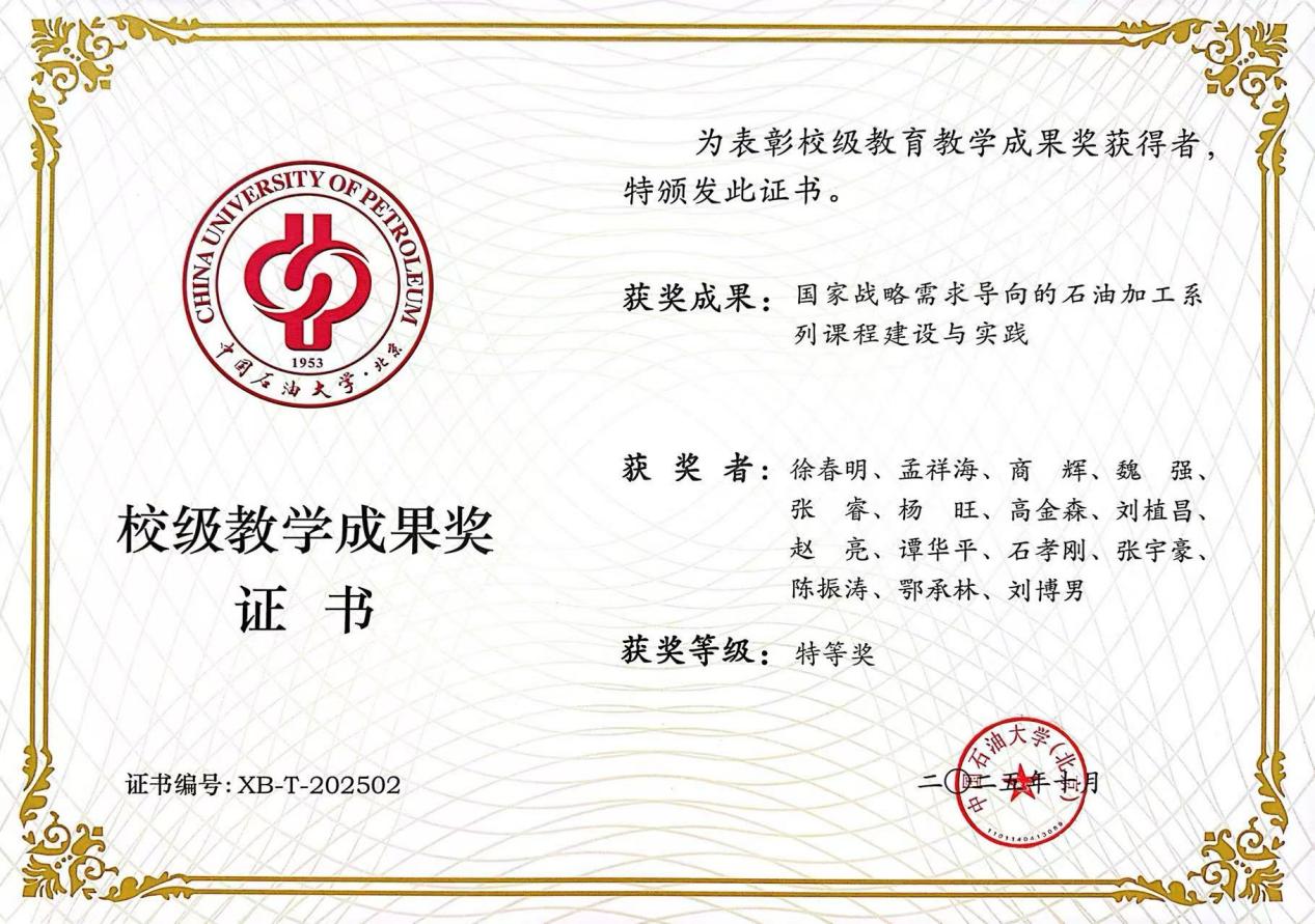 由徐春明院士负责,孟祥海、商辉教授等共同完成的“国家战略需求导向的石油加工系列课程建设与实践”获校级教学成果奖特等奖;由姜桂元负责,吴志杰、孟祥海、刘梦溪等共同完成的“面向国家能源战略需求,与时俱进培养能源化工一流工程实践和创新人才”获校级教学成果奖一等奖,张香平、李倩玮、卢春喜等共同完成的“‘双导师·三平台·四阶段’研究生全链条培养模式的创新与实践”获校级教学成果奖一等奖。