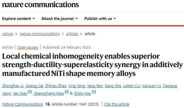 近日,在国家重点研发计划,国家自然科学基金支持下,中国石油大学(北京)新能源与材料学院郝世杰教授研究团队联合北京工业大学毛圣成研究员与同济大学萧遥研究员,在Nature Communications期刊发表题为《Local chemical inhomogeneity enables superior strength-ductility-superelasticity synergy in additively manufactured NiTi shape memory alloys》的研究论文。论文第一作者为新能源与材料学院李仲瀚博士生,北京工业大学蔡吉祥博士生和同济大学赵志豪博士生为共同一作,中国石油大学(北京)为第一完成单位。