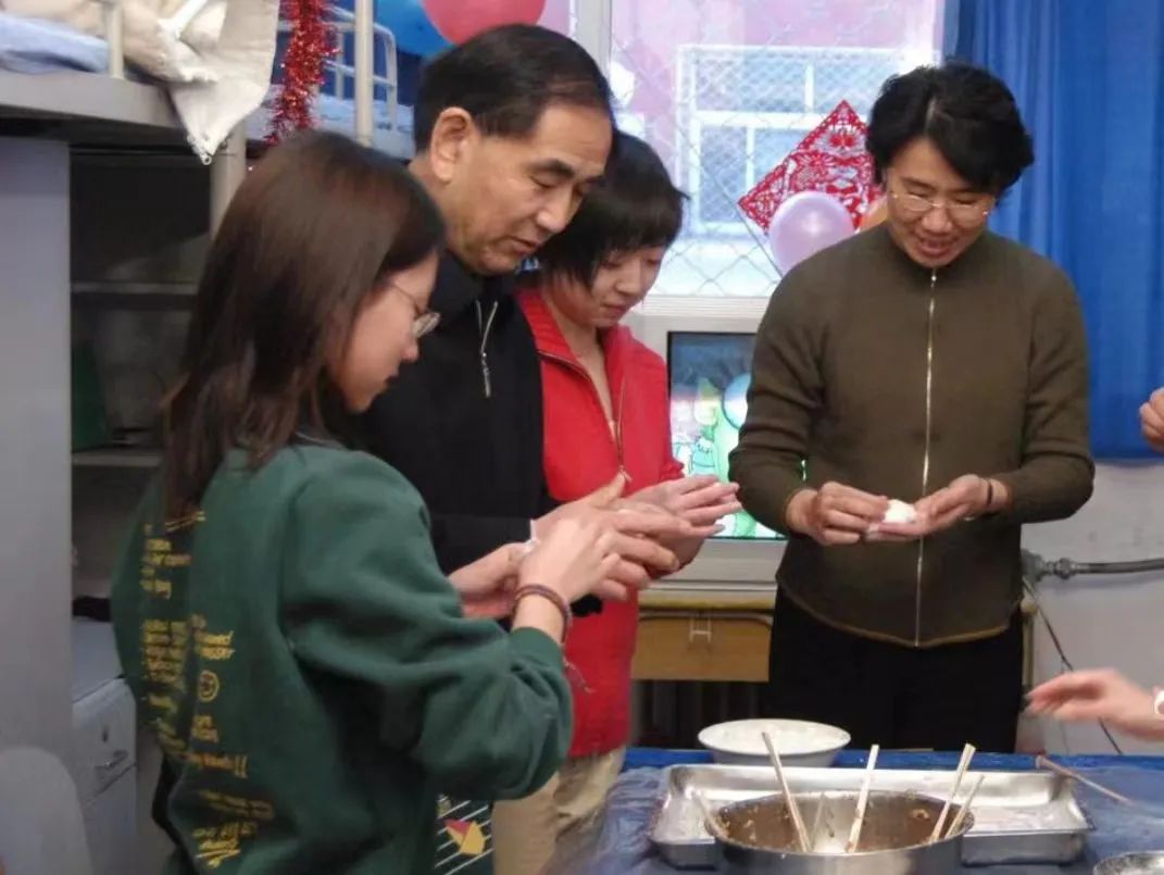2005年除夕校领导李秀生、吴小林与留校学生在润杰宿舍包饺子。