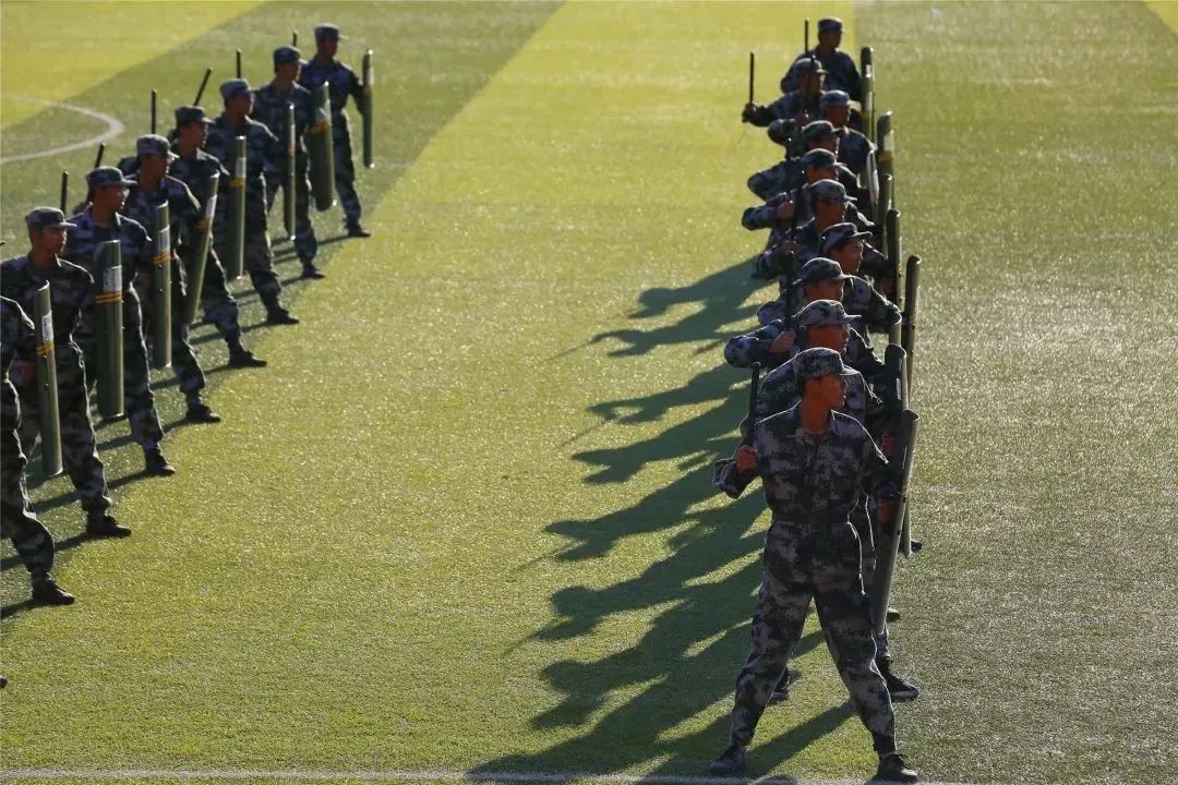在克拉玛依校区的红旗操场上新生认真参加入学军训