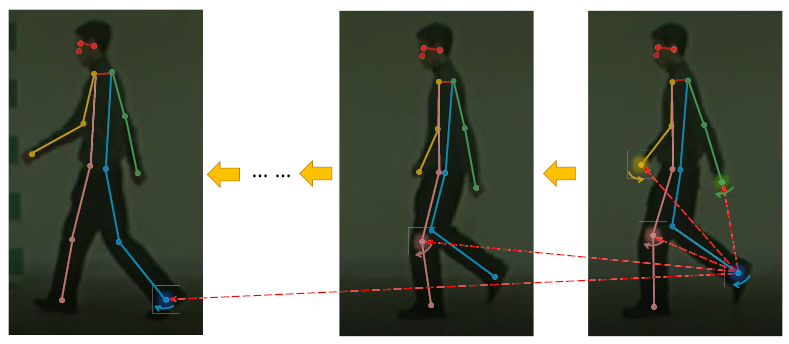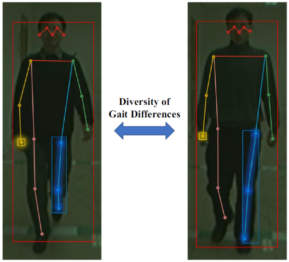 步态识别可以根据个体的行走姿势来识别个体,具有广泛的应用领域,如公共安全、犯罪预防和门禁系统。然而,当前大多数步态识别方法存在以下三个问题:(1)使用轮廓图像作为步态的表示形式,但轮廓信息中包含有关服装和携带物品的细节,存在干扰步态特征的提取的可能性;(2)如图1所示,关节之间的协调关系是步态识别中重要的区分特征,大多数现有方法忽视了步态的协调信息,导致步态特征的区分能力较弱;(3)个体之间的步态变化呈现多尺度性质,不同个体的关节运动、肢体运动和身体姿势存在差异,如图2所示。为此本文提出GaitSkeleton方法,利用骨架序列作为步态的表示形式,同时结合步态协调特征和多尺度步态表征,旨在提取更具区分性的步态特征,从而提高步态识别的准确性和鲁棒性。
