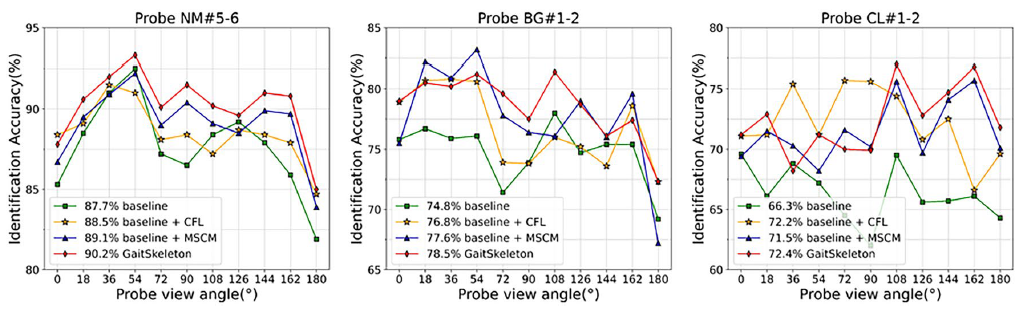 从图8中可以看出,MSCM在不同条件下持续提高了识别准确率,当MSCM应用于Baseline时,在NM条件下提高了1.4%,在BG条件下提高了2.8%,在CL条件下显著提高了5.2%。如图7所示,MSCM提高了几乎所有角度的识别准确率,特别是在CL条件下大角度(大于或等于90°)的情况下。这主要归功于MSCM提取的多尺度特征包含更丰富的判别信息,比单尺度特征更有效地捕捉步态模式,并且肢体尺度和姿势尺度特征分别关注区域和全局运动模式,从而平滑了低质量关节引入的噪音。