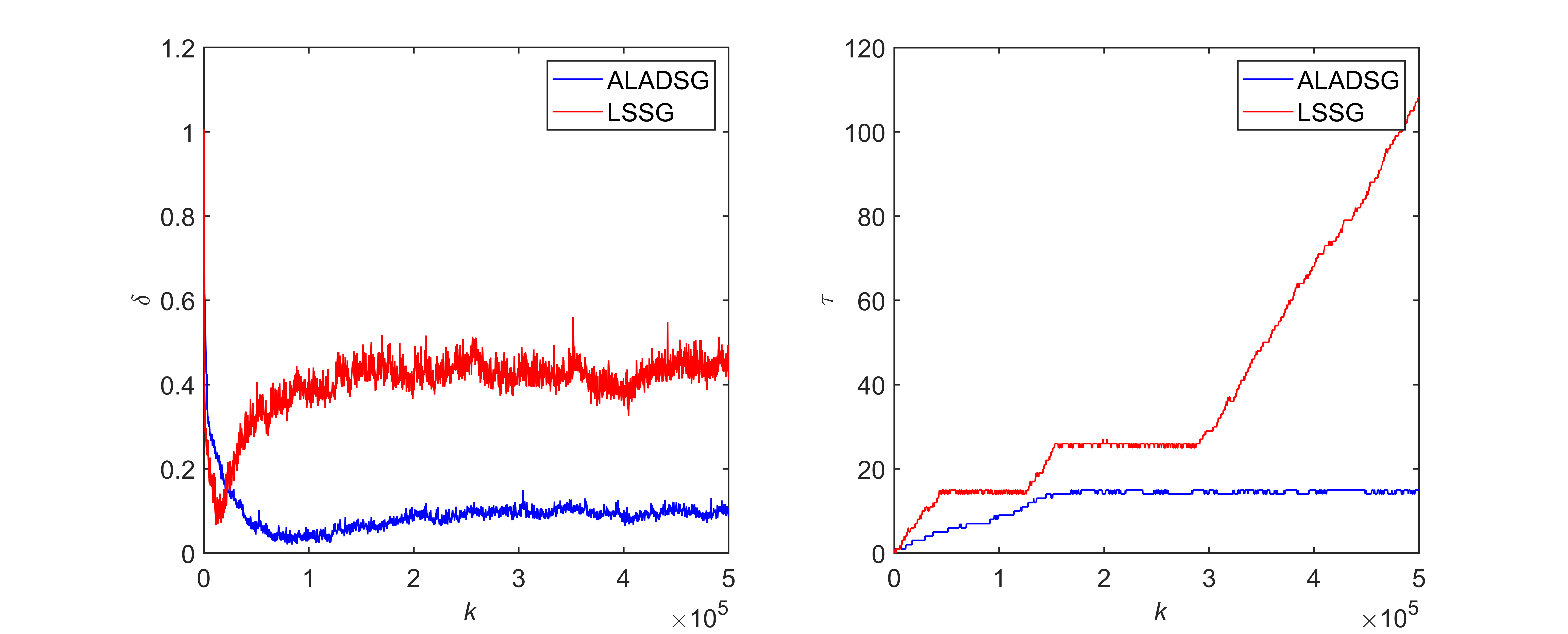 当辨识过程中仅存在白噪声时,基于最小一乘准则函数的两步法(ALADSG)和基于最小二乘准则函数的两步法(LSSG)的辨识曲线和辨识结果如图3和表1所示。