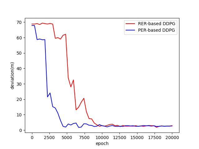 两模型最终都能达到收敛,且收敛后的最大偏移距离基本一致,都在1.5米左右。但基于优先级经验回放机制的DDPG模型的训练效率明显优于基于随机经验回放机制的DDPG模型。在本实验中,基于优先级的经验回放机制的训练效率约为随机经验回放机制的两倍。