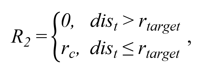 奖励R2是回合奖励,其设置的目的是为了激励智能体到达靶区,其计算公式如下: