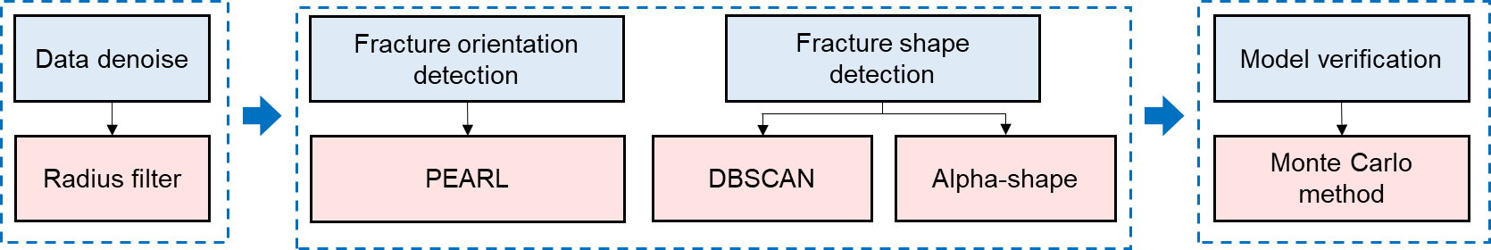 本文首先对微地震事件进行降噪处理,随后通过裂缝方位检测及裂缝形状检测实现对裂缝的重构,最后通过蒙特卡洛模拟验证方法有效性。整体技术流程如下图所示: