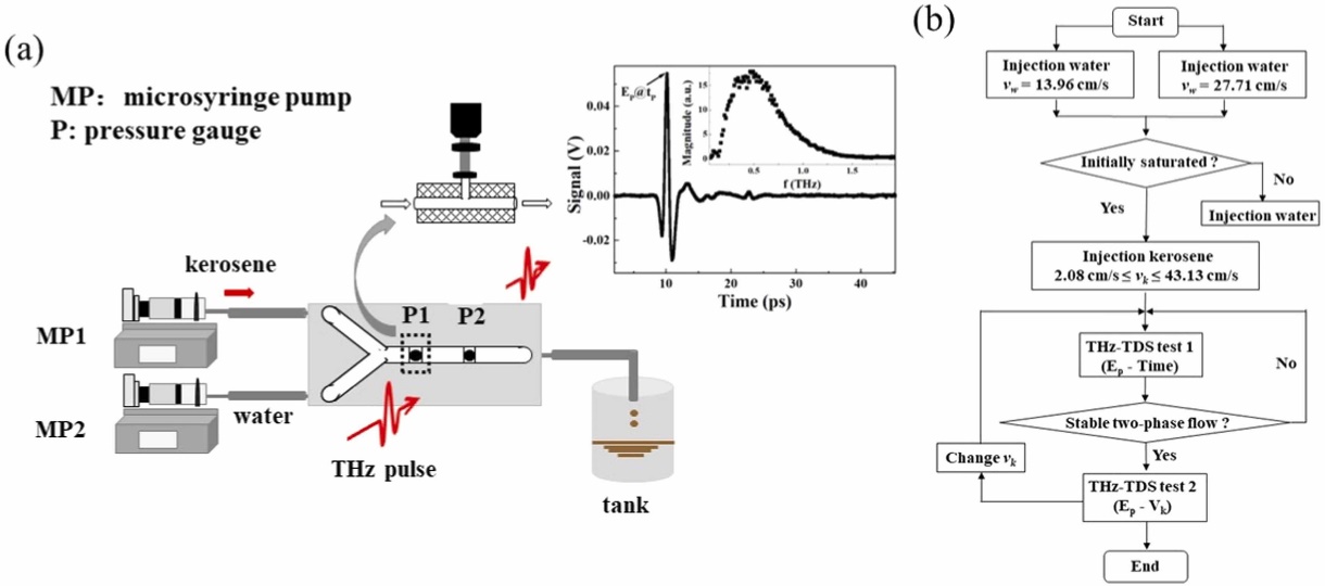 极性分子中由氢键组成的网络结构对太赫兹波产生强烈的吸收作用,非极性分子对太赫兹波的响应体现的主要是分子间的集体振动模式,对太赫兹波的吸收相对较小,因而根据物质分子在太赫兹波段的特征指纹谱,能够灵敏地鉴别不同的物质。太赫兹波不仅可以对流体进行成像分析,还能够提供流体的物理化学信息乃至分子动力学过程或量子互作用过程等重要信息。这使得太赫兹光谱技术在微流体传感甚至是微纳米孔隙中油气流动动力学研究方面存在一定的应用潜力。因此,我们探索性地将太赫兹光谱技术应用于微流体流动参数的分析中,对微通道内油水两相流的流型进行了表征。