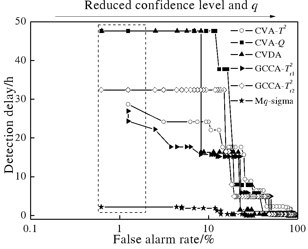 图4.以故障3为例,在置信度水平和q降低时误报率与检测延迟的关系。黑色虚线框代表低远误报率。