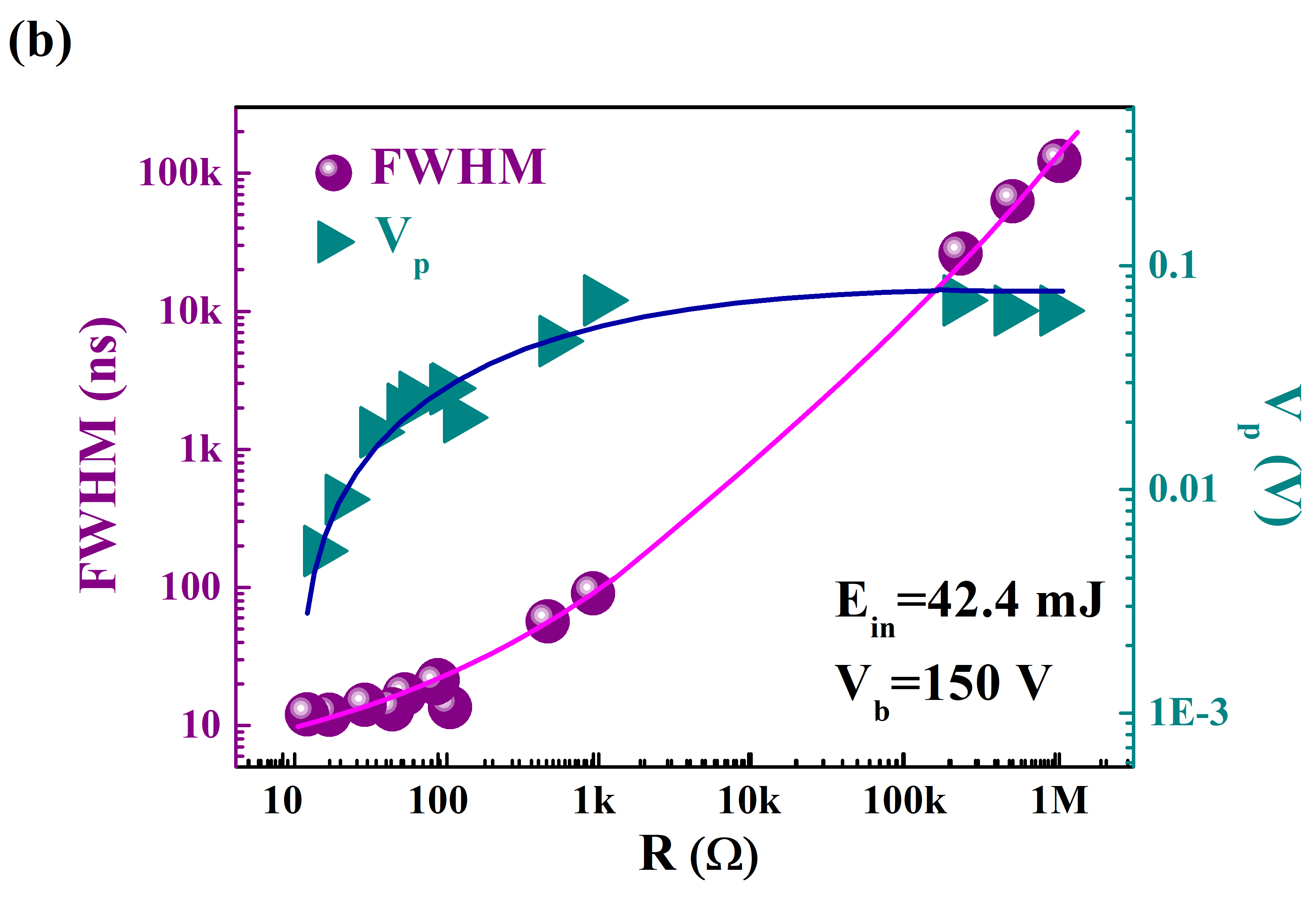 本文提出了一种检测纳秒(ns)脉冲激光能量的方法。偏置电压(Vb)和激光能量(Ein)对食盐的激光感生电压(LIV)信号幅值(Vp)影响较大,Vp随Vb和Ein的增大而增大,信号响应时间约为150µs。受阻抗效应的影响,LIV信号的响应速度和峰值Vp随着负载(R)的减小而增大。当R=100 Ω时,LIV的响应时间与纳秒脉冲激光相似(⁓20 ns),完全受激光脉冲持续时间的限制。该研究表明,食盐的LIV响应具有实时超快单脉冲激光检测的潜力。