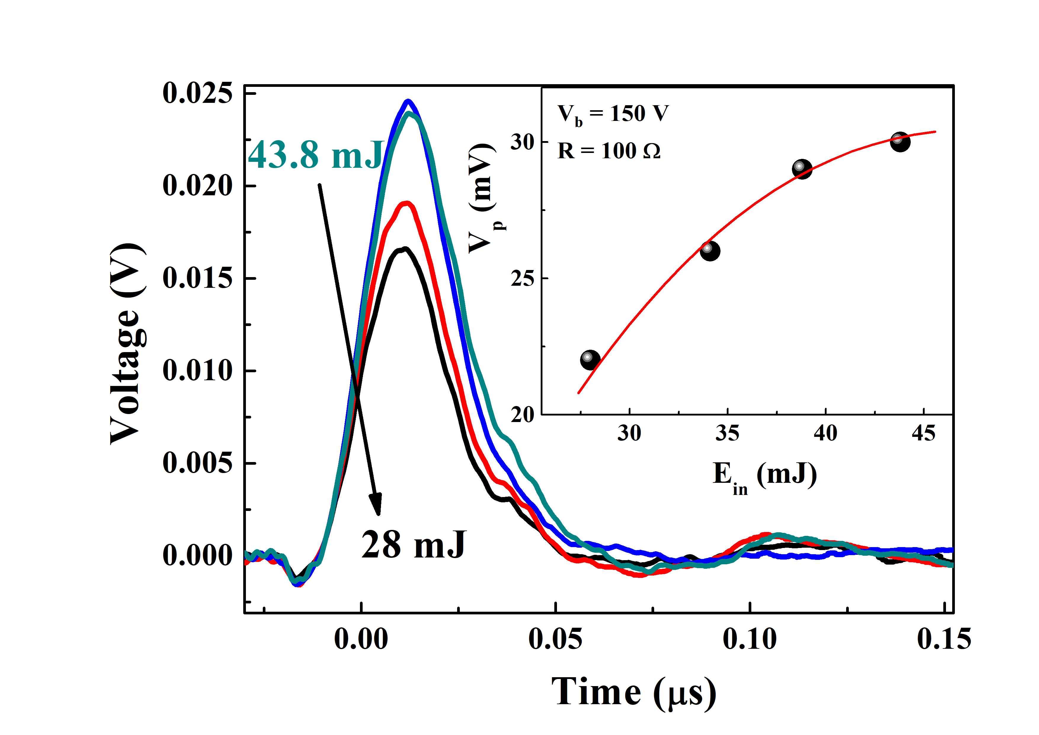 图4显示了LIV的信号随Ein的变化呈单调的正相关关系,单位偏压下的探测响应度为1.93 × 106 m1/2·J-3/2,且监测到的LIV波形与脉冲激光的波形结构类似。