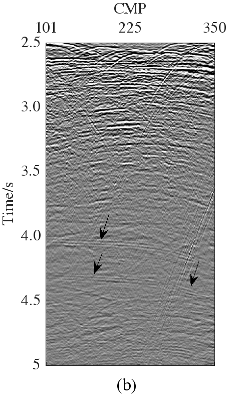 图5a和图5b分别展示了高分辨率方法和本文方法得到的一次波剖面。高分辨率方法估计的结果中仍有明显的多次能量未被压制掉,如黑色箭头所示,而本文方法多次波残留较少,多次波压制更彻底。