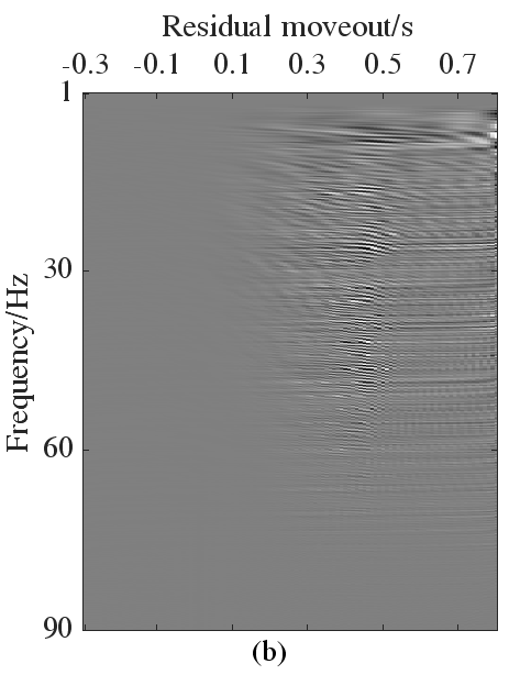 (a)反演的Radon域系数;(b)本文方法估计的多次波Radon域系数