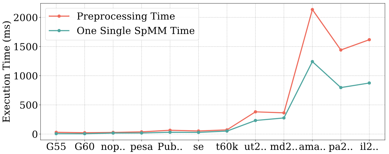 图 7:12个图矩阵上的预处理时间和单次SpMM执行时间的对比