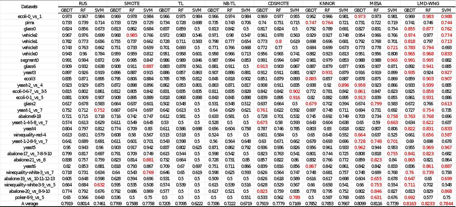 在30个不平衡数据集上进行参数敏感实验,并与其他先进方法进行对比实验,实验结果如下所示。