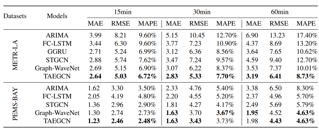 论文提出了一种新的多元时间序列预测模型TAEGCN,其中的可进化图学习器(EGL)能根据该时间段的节点依赖关系来学习不同时间段的图结构,TMSA学习不同元的时间序列特征。对真实世界数据集的实验证明了 TAEGCN 相对于基线模型的优越性。消融实验则进一步证明了模型各部分对预测性能的贡献。