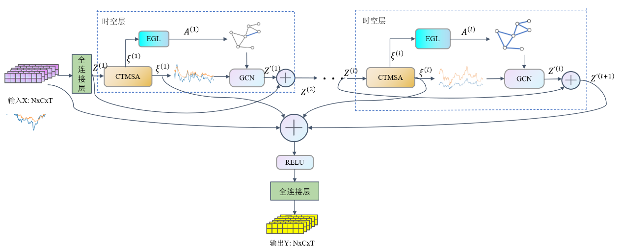 EGL是一种进化的图结构学习器,如图3所示。它以递归方式构造一系列邻接矩阵,提取变量之间的动态相关性,实现更精确地捕获数据中隐藏的空间依赖确立更准确的图结构。