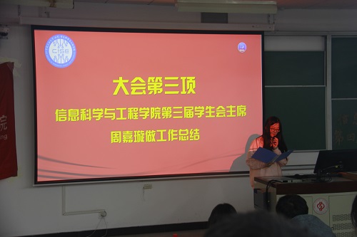 10月16日晚,信息科学与工程学院第四届学生会成立大会在三教106教室召开,学院党委副书记于迎辉、团委书记代莉莎、各社团指导教师、学校及兄弟学院学生组织代表和学院第四届学生会全体成员参加成立大会。