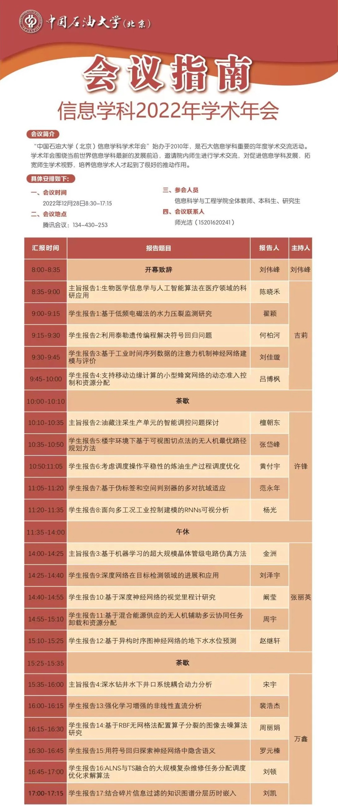 中国石油大学(北京)2022年信息学科学术年会始办于2010年,是石大信息学科重要的年度学术交流活动,年会围绕当前学院师生的最新科研成果,旨在促进信息学科之间成果的深度交流和研讨,推动我院师生科研能力的持续发展。
