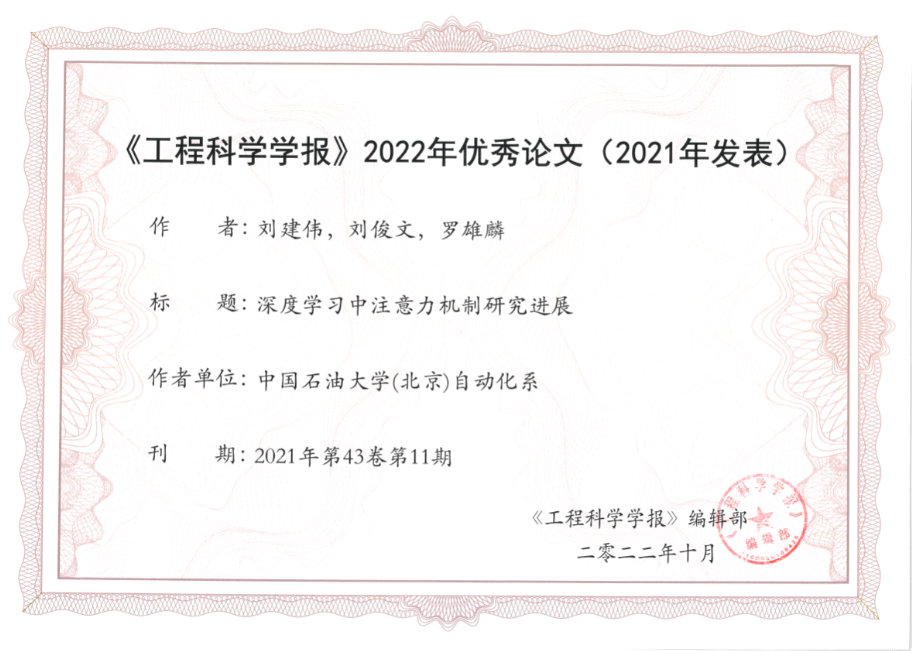 近日,学院控制科学与工程专业2018级硕士研究生刘俊文在国内学术期刊《工程科学学报》上发表题为《深度学习注意力机制研究进展》的学术论文,被评为《工程科学学报》2022年度优秀论文(2021年发表),指导教师为自动化系刘建伟副教授和罗雄麟教授。
