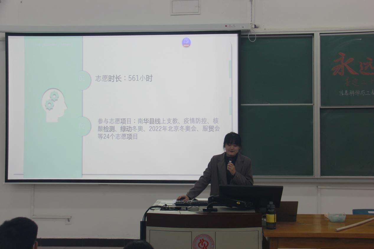 为弘扬志愿服务精神,分享志愿活动故事,加强志愿实践意识,10月11日,信息科学与工程学院在第三教学楼307教室举办“青春心向党 奋进新征程”第二期主题团课——志愿精神专题宣讲。学院青年志愿者协会指导老师李佳潞、学院2019级优秀志愿者马婉蓉、2020级优秀志愿者陈欣岩、杨淑鑫及全体大一新生参与会议。