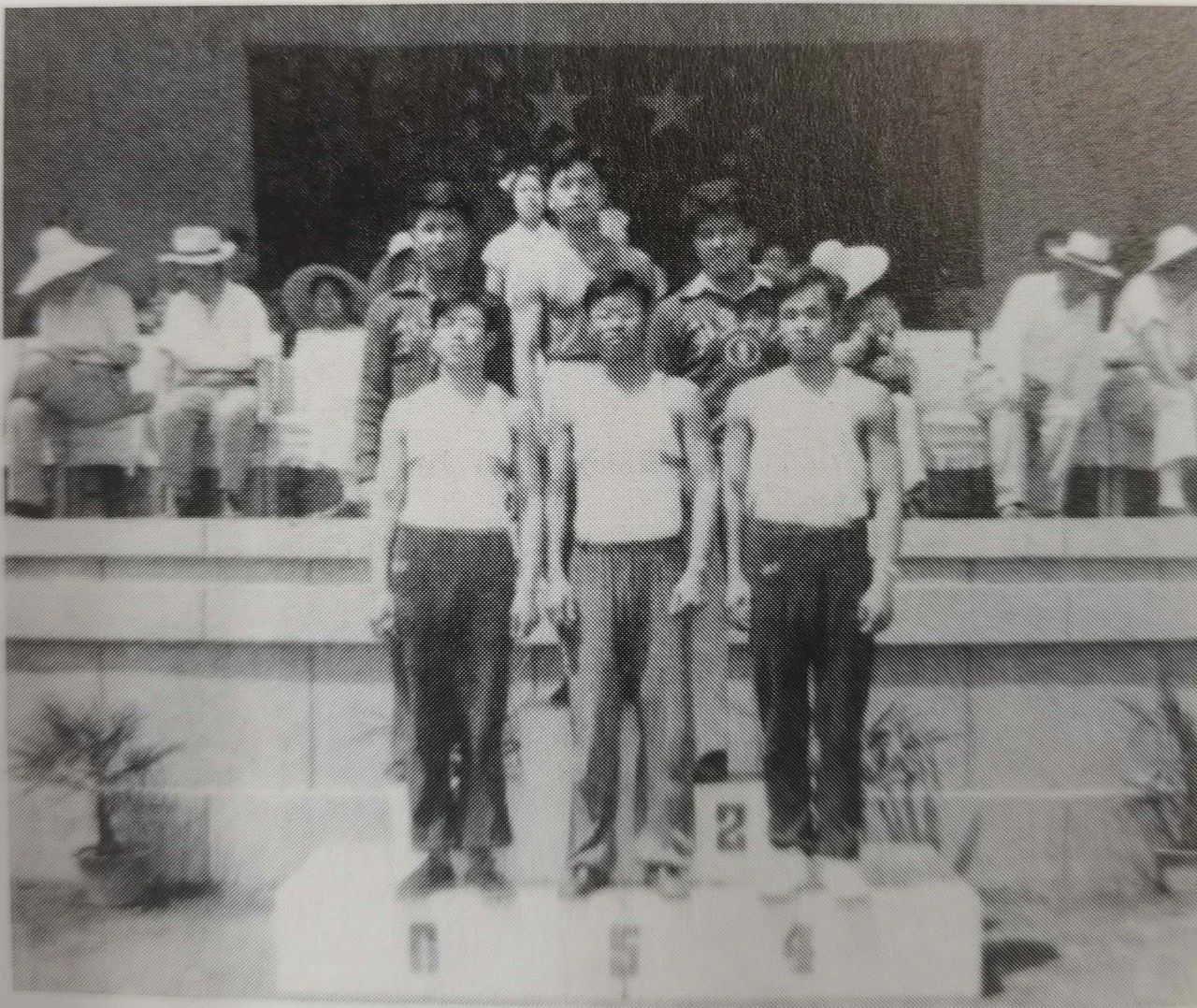 1959年高校运动会中,链球组在颁奖台上