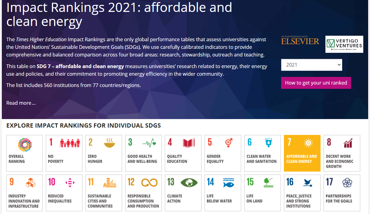 The Times Higher Education Impact Rankings was first released in April, 2009. Different from the traditional rankings, it measures the contributions of universities to society and human community based on the 17 UN's Sustainable Development Goals (SDGs), aiming to investigate the universities' missions of social service. This is helpful for universities to run with characteristics and make efforts to achieve international standards.