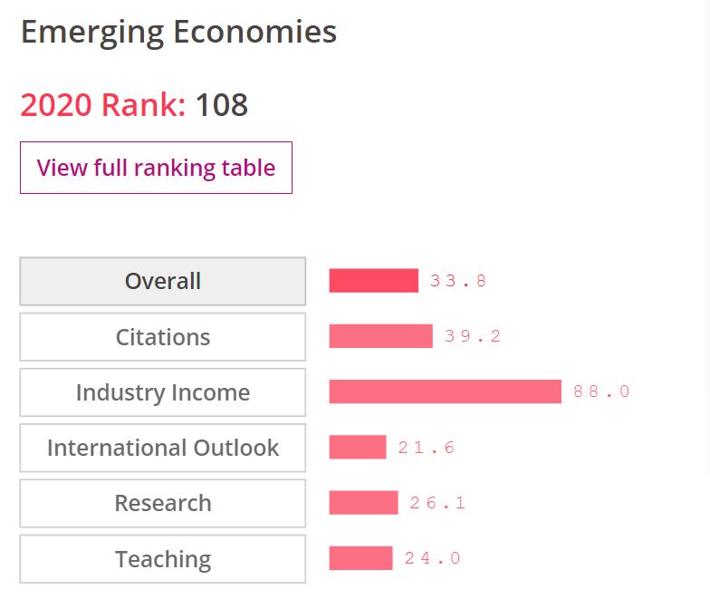 Emerging Economies University Rankings 2020 of THE have been published annually since 2014, which compares universities in advanced emerging, secondary emerging and frontier economies in the FTSE Global Equity Index Series.