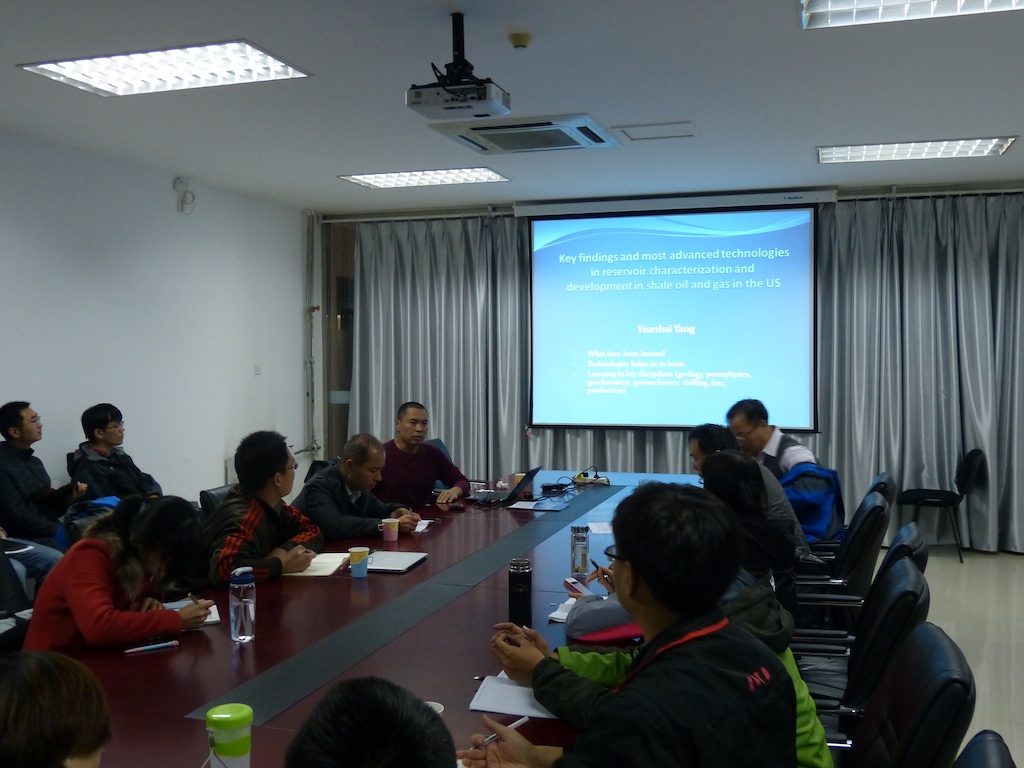2013年10月28日,应我院葛洪魁教授的邀请,美国Anadarko石油公司油藏工程顾问杨远海博士访问了非常规天然气研究院,并围绕美国页岩气开发的关键技术做了学术交流,报告的题目是《Advanced technologies and key findings in reservoir characterization and development in shale oil and gas in the US》。
