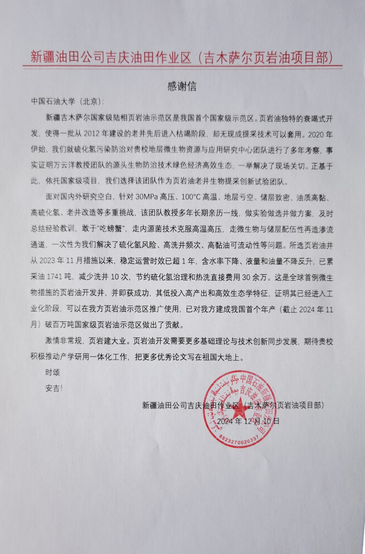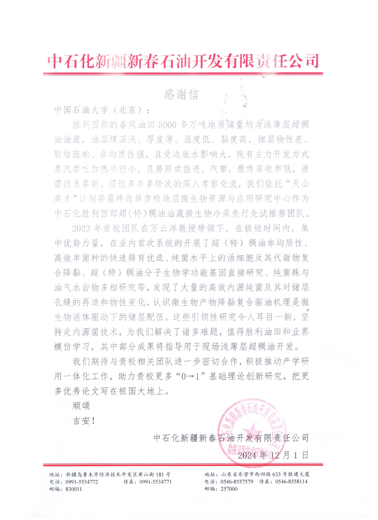 中石化新疆新春石油开发有限责任公司、中石油新疆油田公司吉庆油田作业区(吉木萨尔页岩油项目部)分别向中国石油大学(北京)发来感谢信,对学校参加胜利西部浅薄层超(特)稠油生物冷采技术研发、非常规页岩油老井生物提采研发的万云洋教授及其团队表示感谢。