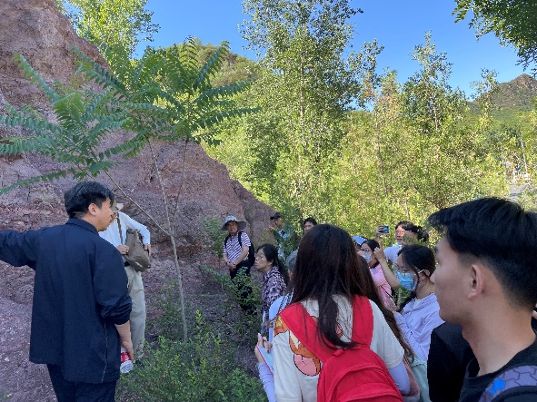 参观结束后,师生们乘车赴南雁路田庄村附近开展野外油气地质教学实践活动,几位老师带学生们观察剖面,深入讲解相关的构造、沉积知识,分析探讨露头的岩性、岩相和断层等。虽然天气十分炎热,但同学们依然学习热情高涨,积极讨论并和老师交流学习。