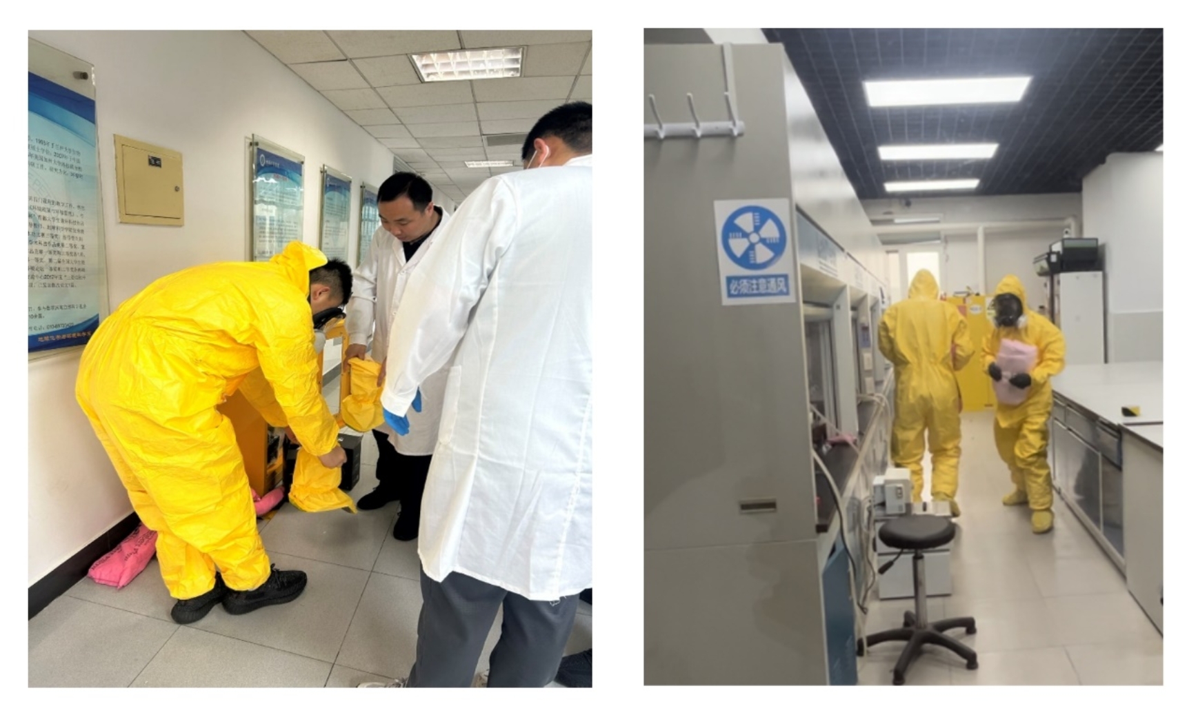 5月16日,学院组织腐蚀性化学品溢洒应急处置演练活动以及应急喷淋和洗眼器的使用,学院安全员师生宝、孙海霞,院督查组成员朱雷、高丽明以及科研和教学实验人员、教师代表和学生代表参与其中。通过此次活动锻炼了突发情况的处理能力,包括上报流程的熟悉、现场的应急处理、防护服等防护设备的穿戴和使用,疏散逃生和应急喷淋及洗眼器的使用,有助于加强实验室安全操作的意识、提升应急处置能力。