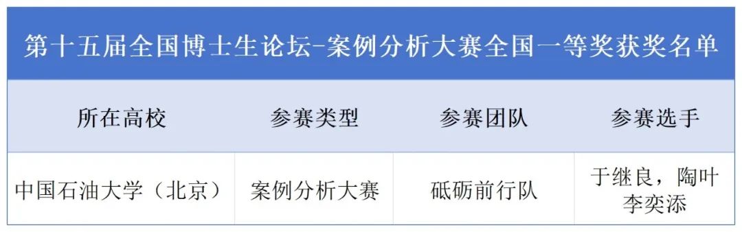 为提升学生专业素养,增进国内外高校学术交流,拓宽视野,培育高素质人才,以助力“双碳”目标实现,中国石油大学(北京)围绕“油气产业绿色、低碳与智能化发展技术及其应用”主题,举办第十五届全国博士生学术论坛(FPEF)。地球科学学院2023级研究生于继良、陶叶、李奕添,组成参赛团队,荣获“案例分析大赛”全国一等奖。