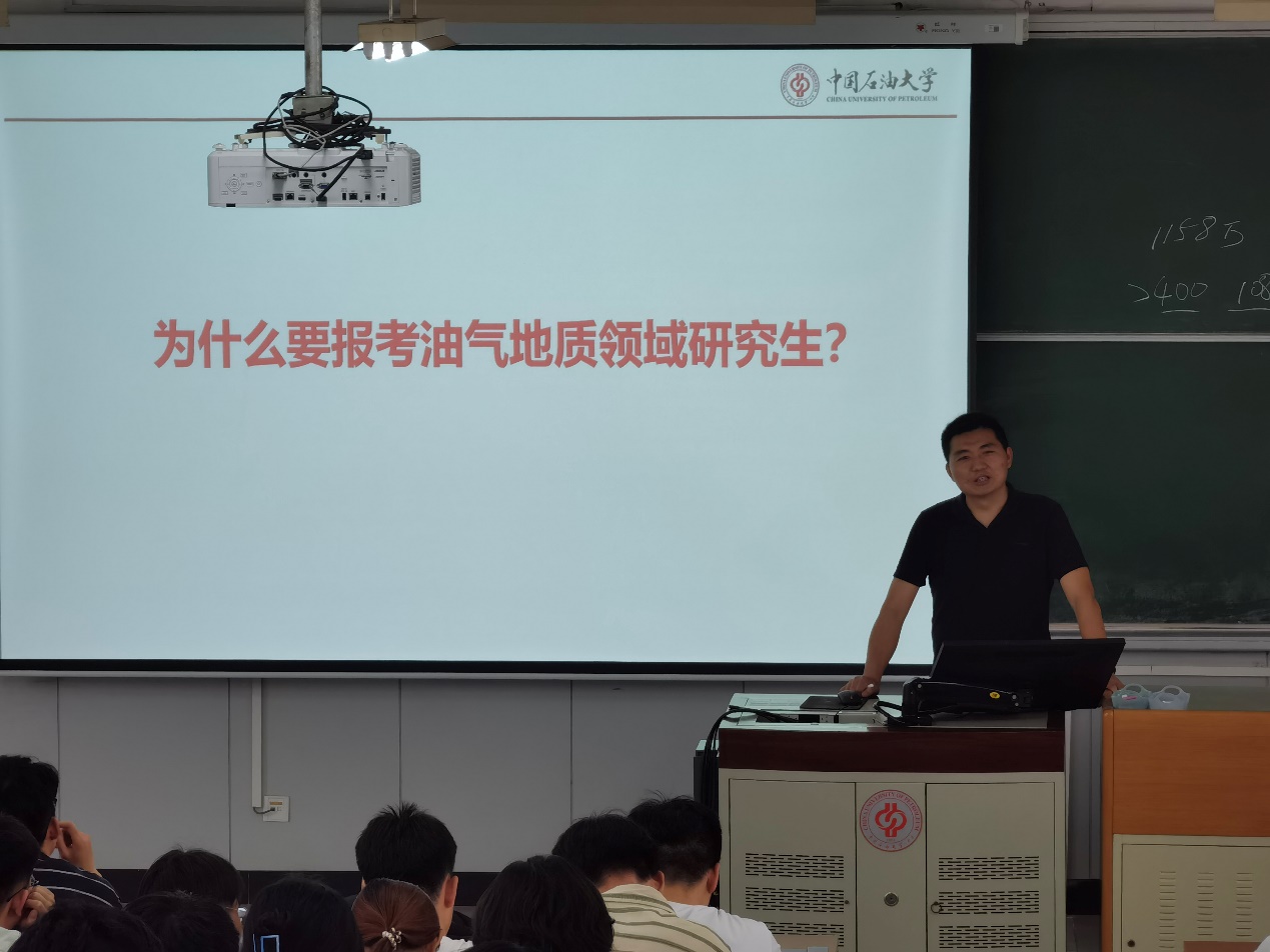 会议伊始,刘钰铭老师从我国原油供需情况、世界能源格局、国家能源行业发展等多方面讲述报考油气地质领域研究生的必要性。同时从学院师资队伍、学科发展、项目经费、硬件设施、科研成果等多方面讲述地球科学学院学科优势与特色,解答学生疑问。