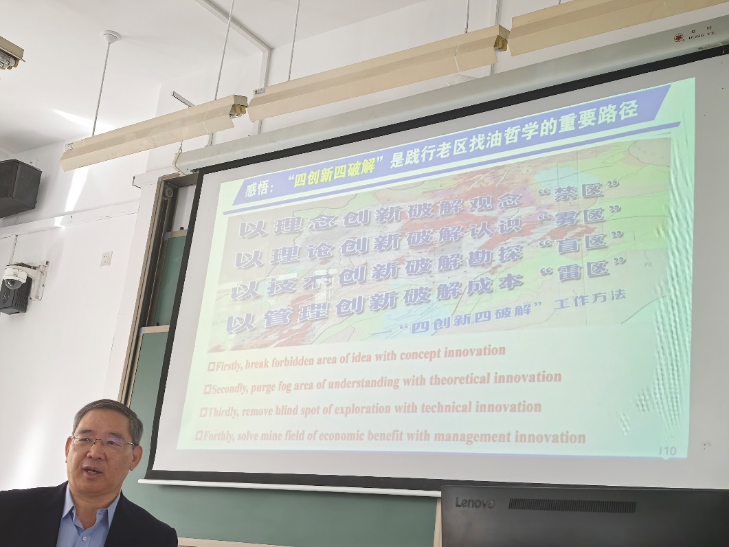 赵贤正专家围绕超级能源盆地打造第二曲线的探索与实践的主题,从超级能源盆地第二曲线、常规油气二次勘探、非常规页岩油效益开发、油气与新能源融合发展等几个方面进行深入阐述。赵贤正专家以渤海湾盆地冀中坳陷为例,介绍中石油华北油田勘探开发艰苦奋斗历程,分析找油哲学在常规油气勘探中的应用实践;以渤海湾盆地黄骅坳陷为例,剖析中石油大港油田古近系孔二段页岩油六项地质认识与浅层低温地热能开发现状与未来。与师生生分享“四创新四破解”的感悟:以理念创新破解观念禁区、以理论创新破解认识雾区、以探索创新破解认识盲区、以管理创新破解成本雷区。勉励同学们阅读《找油哲学》(W.E.Pratt, AAPG Bulletin, 1982)、《断陷盆地富油凹陷二次勘探工程》(赵贤正,科学出版社, 2012)等书籍,培养哲学素养和创新意识。