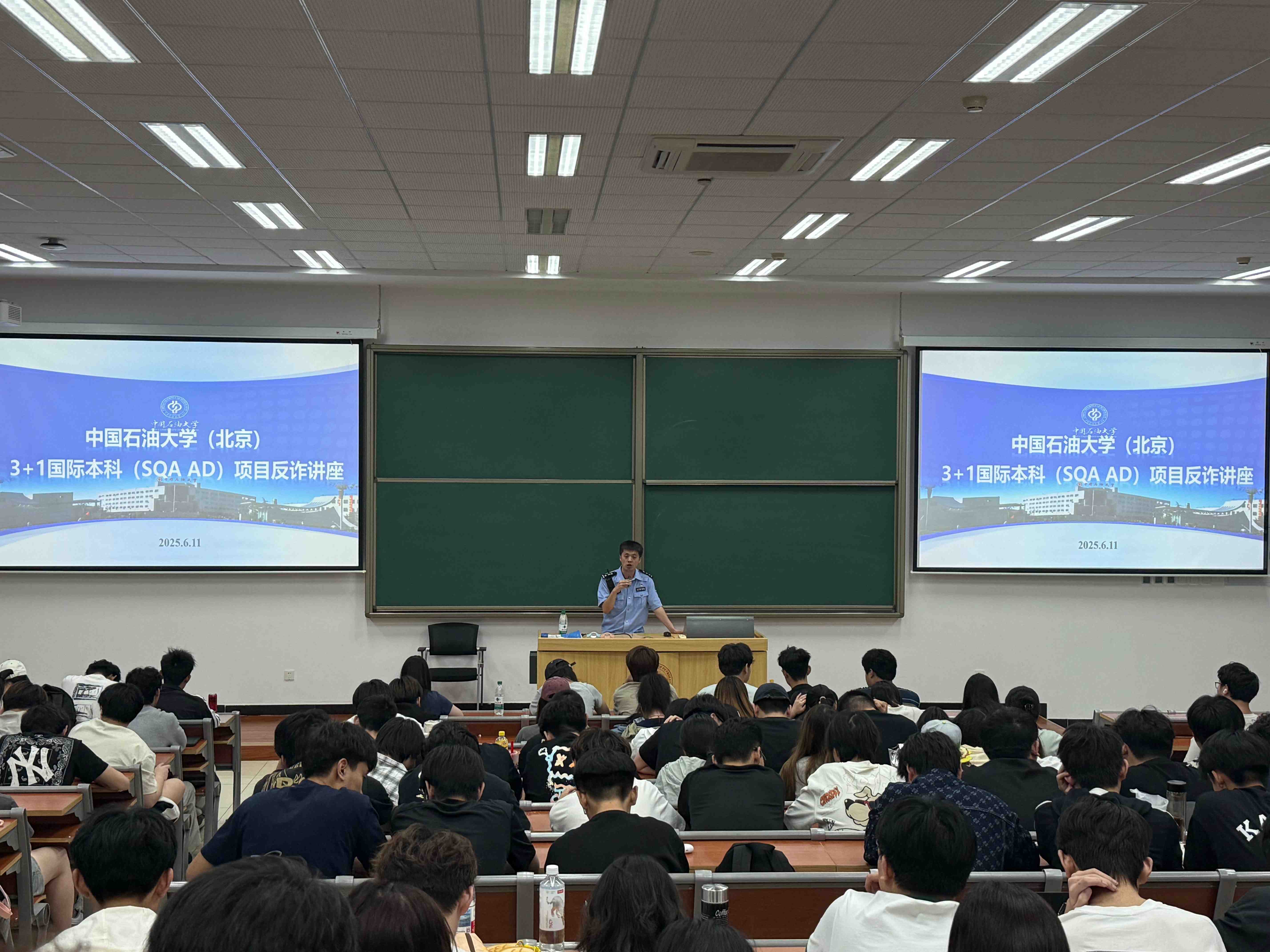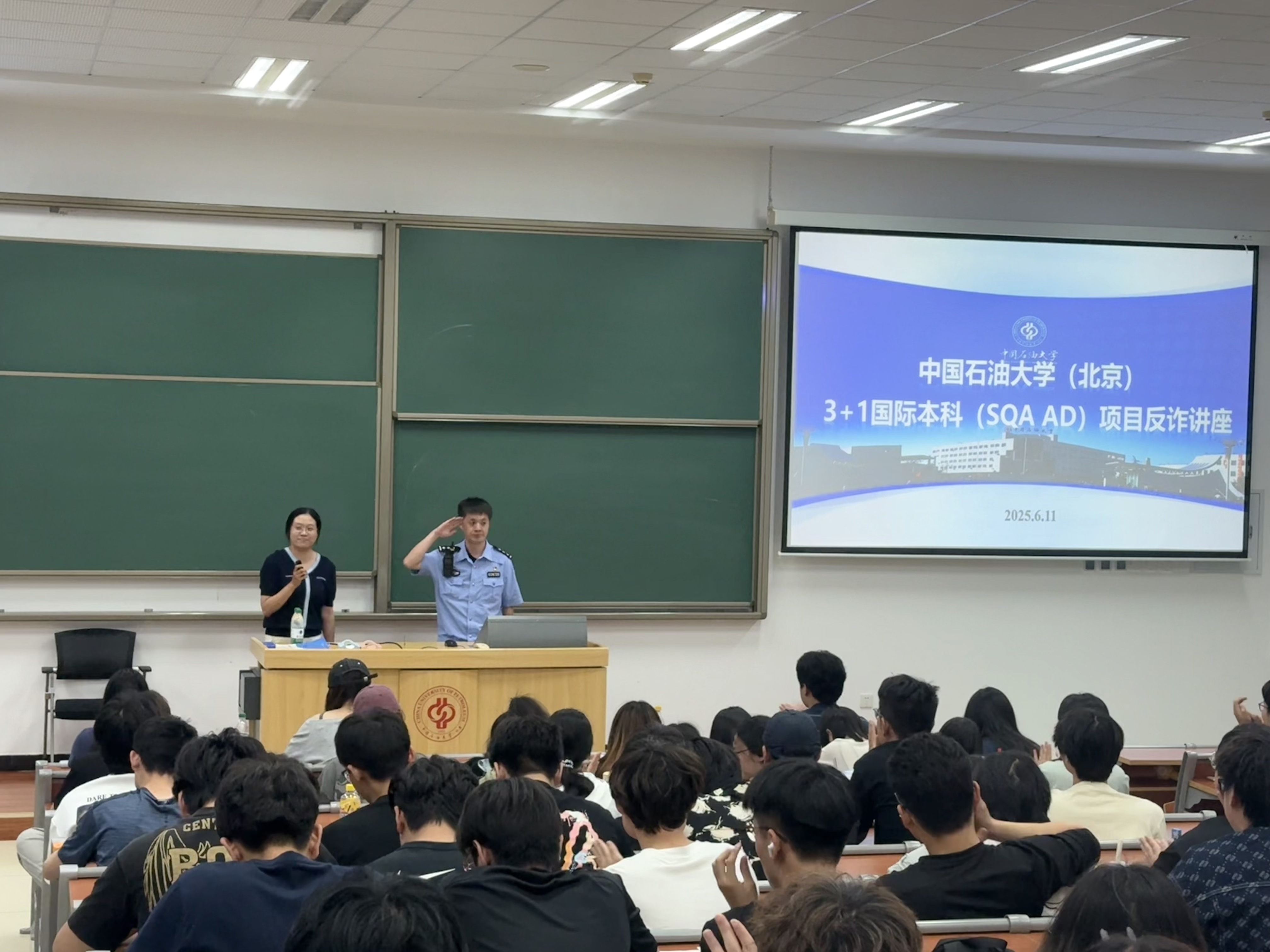 为有效提升学生的防诈骗意识,增强对各类诈骗手段的识别和防范能力,2025年6月11日,中国石油大学(北京)SQA项目邀请松园派出所副所长朱旭警官为学生干部开展主题为“反诈宣传进校园”的安全教育讲座。本次讲座由出国留学教育中心主任万璐老师主持。