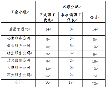 我校现有后勤在编在岗职工56人,非在编人员400余人。根据《中国工会章程》和《北京市高等学校教职工代表大会工作规程》有关规定,结合目前后勤人员状况,第四届“职代会”由全体在编在岗正式职工做为正式代表,同时由各公司推选17名非在编人员,作为正式代表参加“职代会”,正式代表共73人。此外,各实体公司关键岗以上非在编人员可以做为列席代表参加大会。