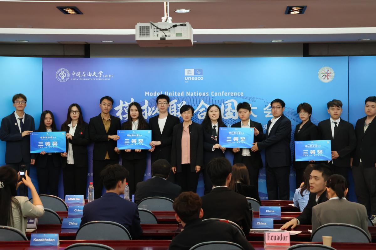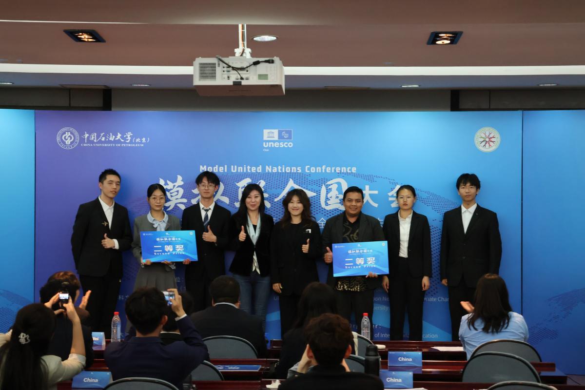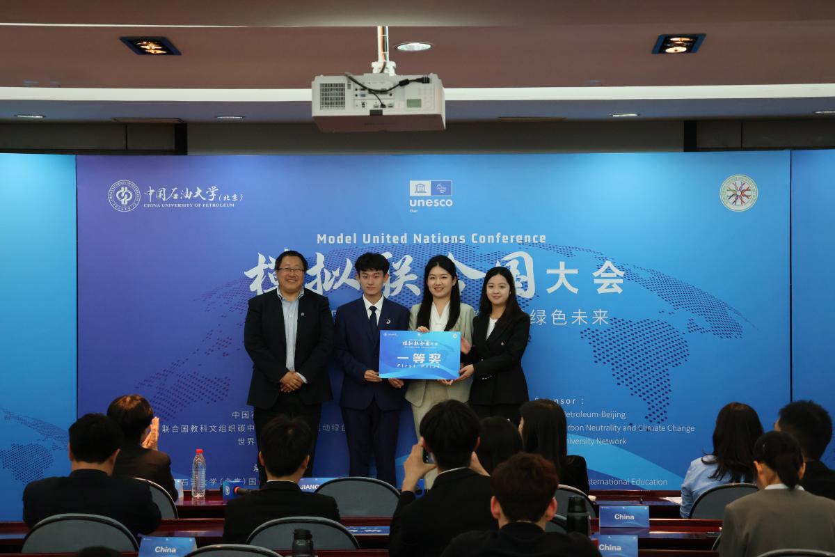5月7日,以“讲好中国能源故事,共筑全球绿色未来”为主题的模拟联合国大会在中国石油大学(北京)举办。中石大副校长张广清,联合国工业发展组织投资和技术促进办公室(中国・北京)环境与气候议题负责人姜灏,中科浩博国际教育科技(北京)有限公司总裁孙中雯,学校国际合作与交流处、国际教育学院、教务处、外国语学院相关人员,来自中国、巴基斯坦、土库曼斯坦、南苏丹、蒙古、孟加拉国等24个国家的100名青年学生围绕气候变化、能源转型与可持续发展等议题展开深入对话。