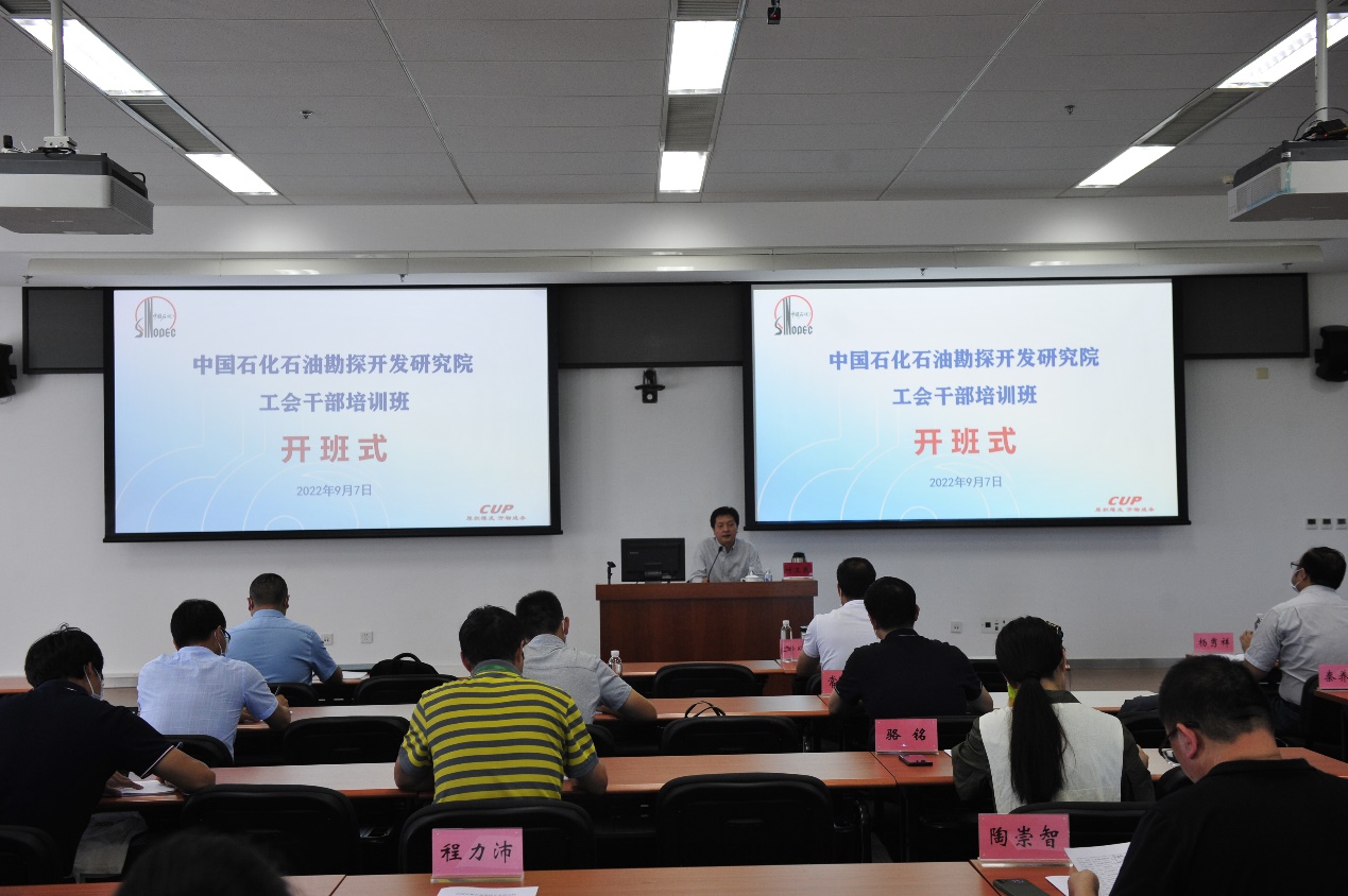 2022年9月7日,由中国石化石油勘探开发研究院主办,中国石油大学(北京)承办的“工会干部培训班”在北京怀柔正式开班。中国石化石油勘探开发研究院党委副书记、工会主席叶卫东出席开班式并讲话。