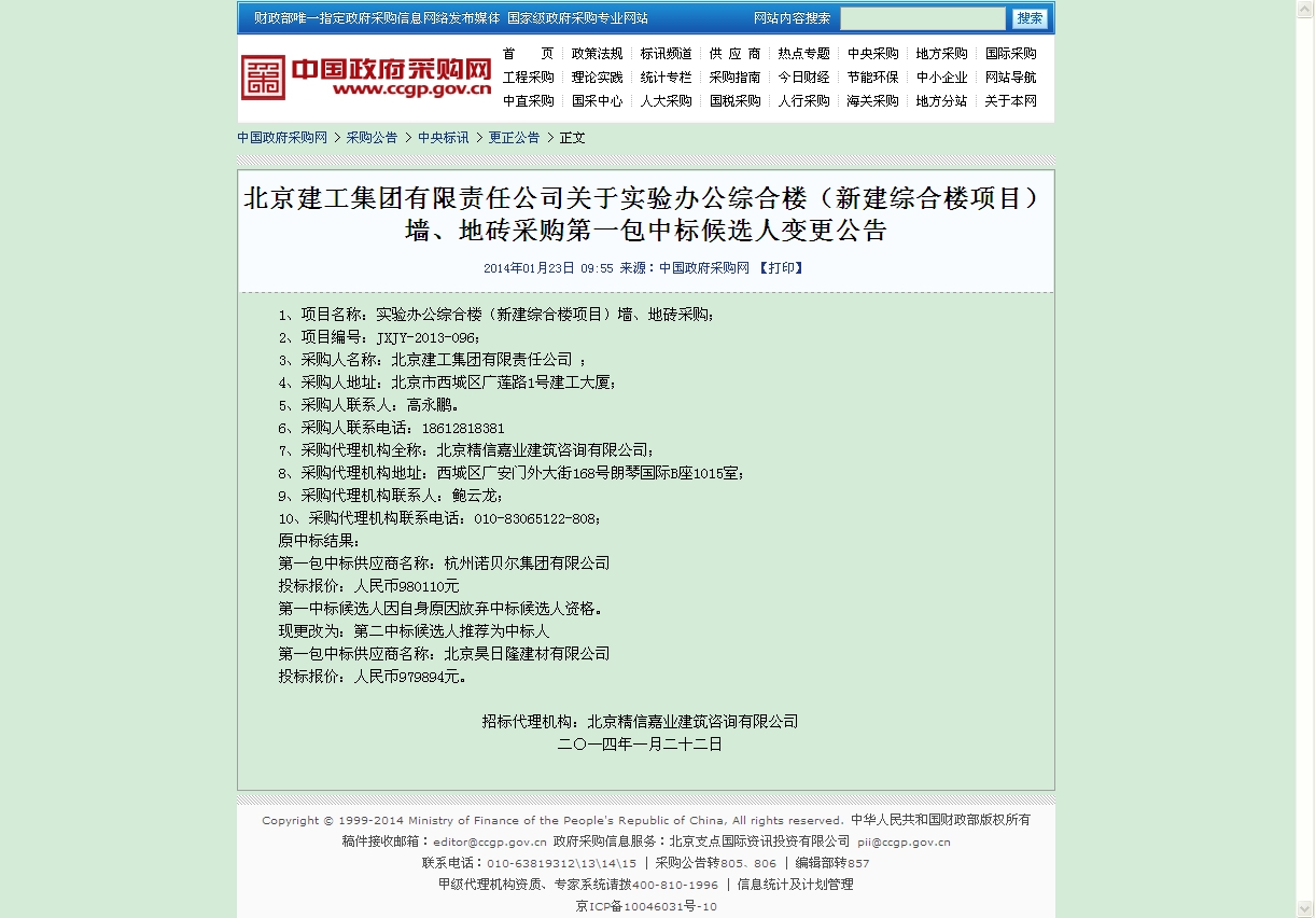 中国政府采购网中国石油大学(北京)实验办公综合楼(新建综合楼项目)墙地砖采购中标候选人变更公告