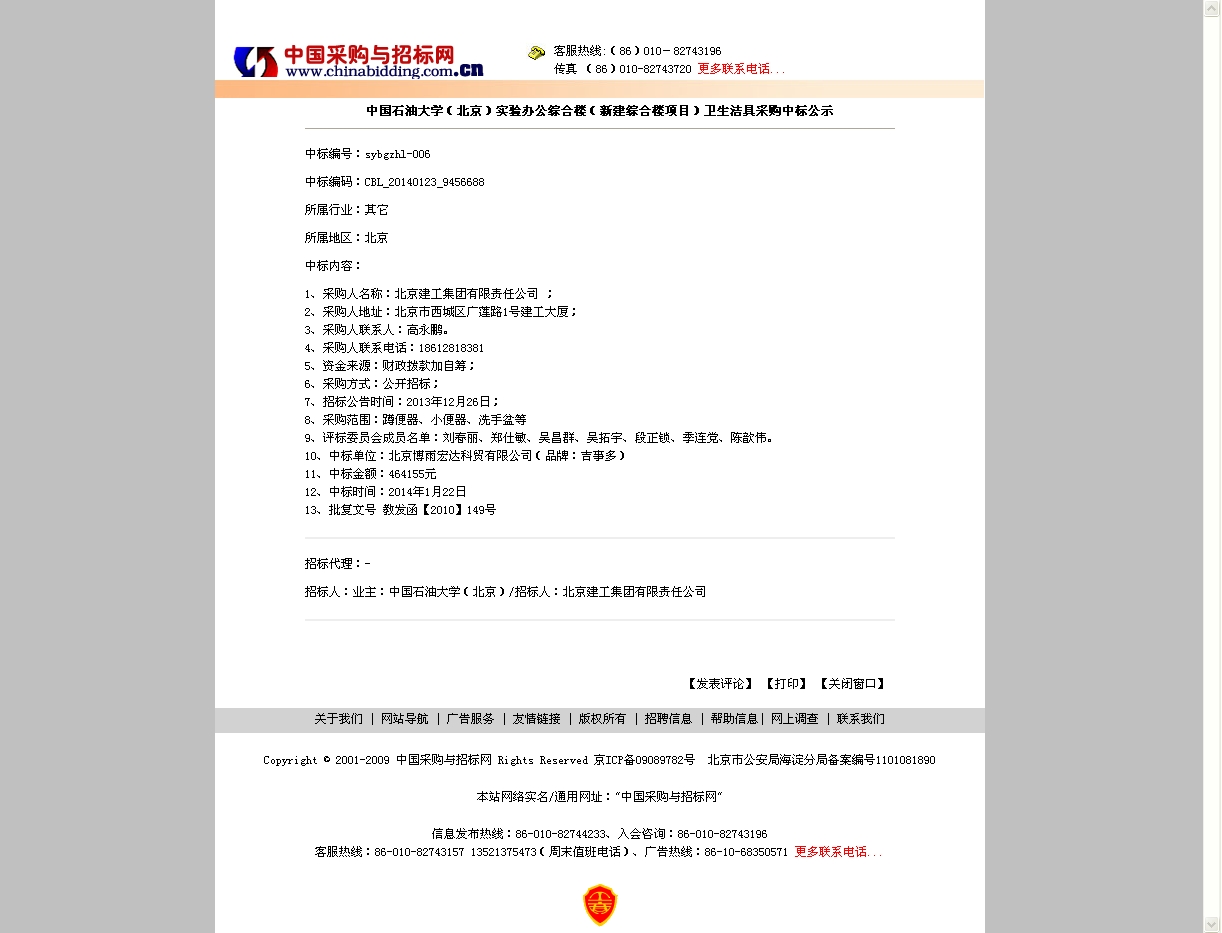 附图: 中国采购与招标网中国石油大学(北京)实验办公综合楼(新建综合楼项目)卫生洁具采购招标结果公示