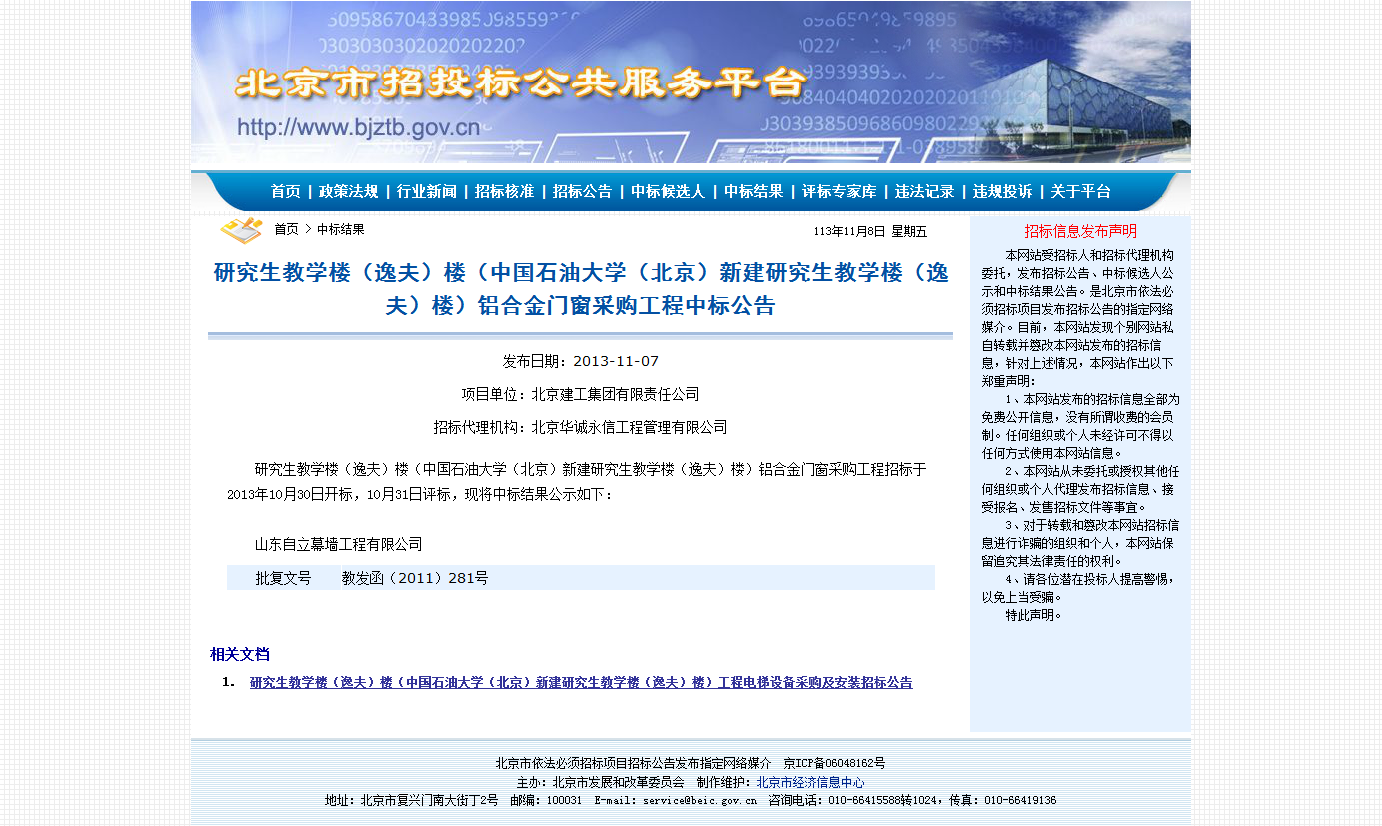 附图:北京市招投标信息平台网站研究生教学楼(逸夫)楼工程铝合金门窗采购中标公告