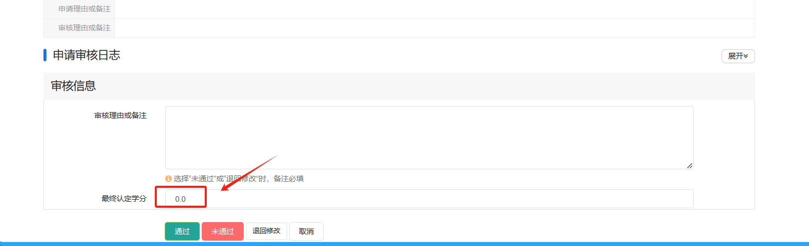 注:审核时,下方的最终认定学分默认为0,需要修改成认定学分后再进行审核。