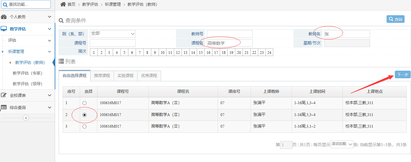 2.结合查询条件,查找出所要评教的课程。点击该课程前面的单选按钮,然后点击“下一步”。