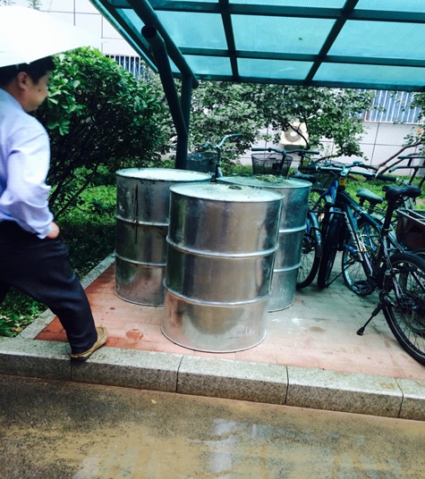 2015年国庆节前科技处保卫处实验室安全联合检查过程中,发现工程东楼西侧南端自行车棚内堆放有三个大油桶,存放材料疑似油品类实验材料,见下图。