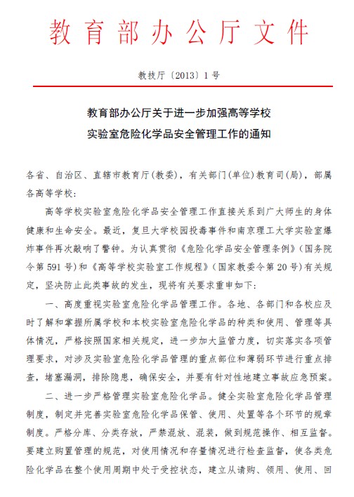 近期收到教育部办公厅关于进一步加强高等学校实验室危险化学品安全管理工作的通知,现转发给你学习落实。